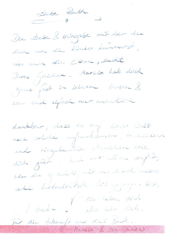 Liebe Ruth! Die Liebe und Hingabe, mit der du dich um die Kinder kümmerst, aber auch die Eltern, sucht Ihres Gleichen. Marcio hat dich ganz fest in seinem Herzen & und wir sind einfach nur unendlich dankbar, dass es auf dieser Welt noch solche aufmerksamen, bescheidenen und hingabevolle Menschen wie dich gibt. Und vor allem dafür, wie du geduldig mit uns durch unsere wohl turbulenteste Zeit gegangen bist. Danke! Wir haben dich alle sehr lieb. Für die Zukunft nur das Beste. Marcio & Die Diazes